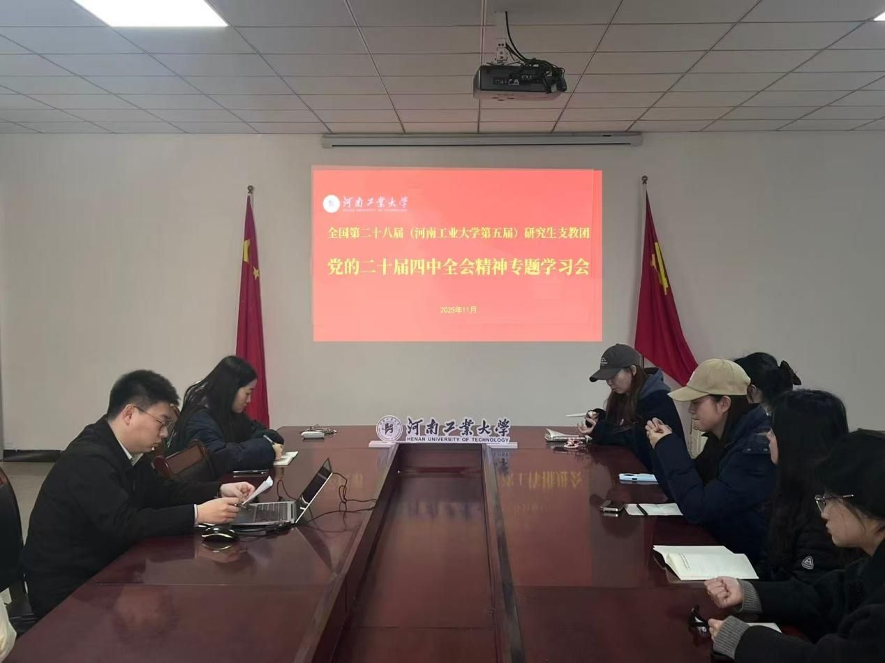 为深入学习贯彻党的二十届四中全会精神,学校研究生支教团工作办公室于11月28日组织召开专题学习座谈会,集中学习全会公报精神,深刻领会推进国家治理体系和治理能力现代化的重大意义,全体全国第28届(河南工业大学第五届)研究生支教团成员参加学习。学习会由校团委组织部部长吕文慧领学,校研究生支教团工作办公室负责人李远宏主持。