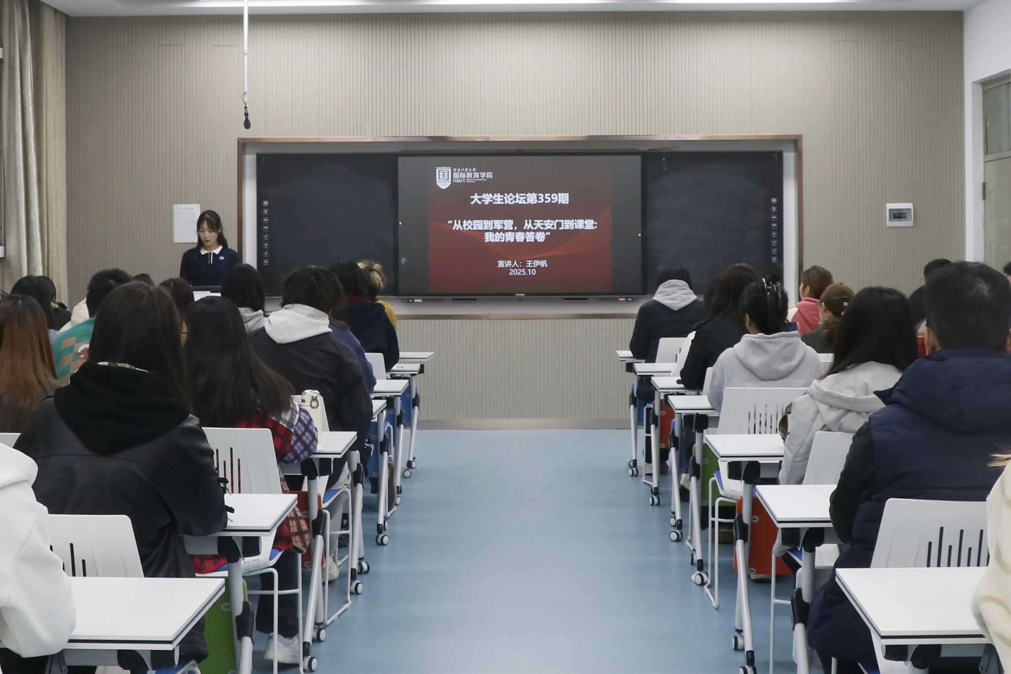 为助力大学生在成长路上锚定方向、汲取奋进力量,10月22日下午,由校团委主办,国际教育学院承办的第359期大学生论坛暨国际教育学院第四期果园青年夜校在惟学楼6126活动室举办,论坛主题为“从校园到军营,从天安门到课堂——我的青春答卷”。本次论坛邀请了河南工业大学国际教育学院会计学2305班学生王伊帆担任主讲嘉宾,分享其作为民兵方队的一员,在纪念中国人民抗日战争暨世界反法西斯战争胜利80周年阅兵大会上,接受党和人民检阅的故事。国际教育学院全体辅导员老师及100余名学生共同参与了本次活动,论坛由学院团委副书记郭雨梵、夜校负责人高怡寒主持。