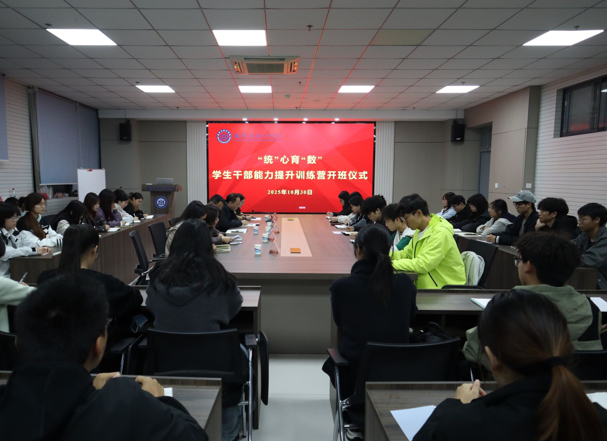 为切实加强学生干部的教育、培养和管理,夯实学生干部成长根基,增强学生干部队伍的凝聚力、战斗力,数学与统计学院于10月31日下午在惟德楼315会议室举行“统”心育“数”学生干部能力提升训练营开班仪式。校团委副书记吴鹏,数学与统计学院党委副书记程凯、各年级辅导员及全体学生干部参加了开班仪式。大会由数学与统计学院团委书记刘姗主持。