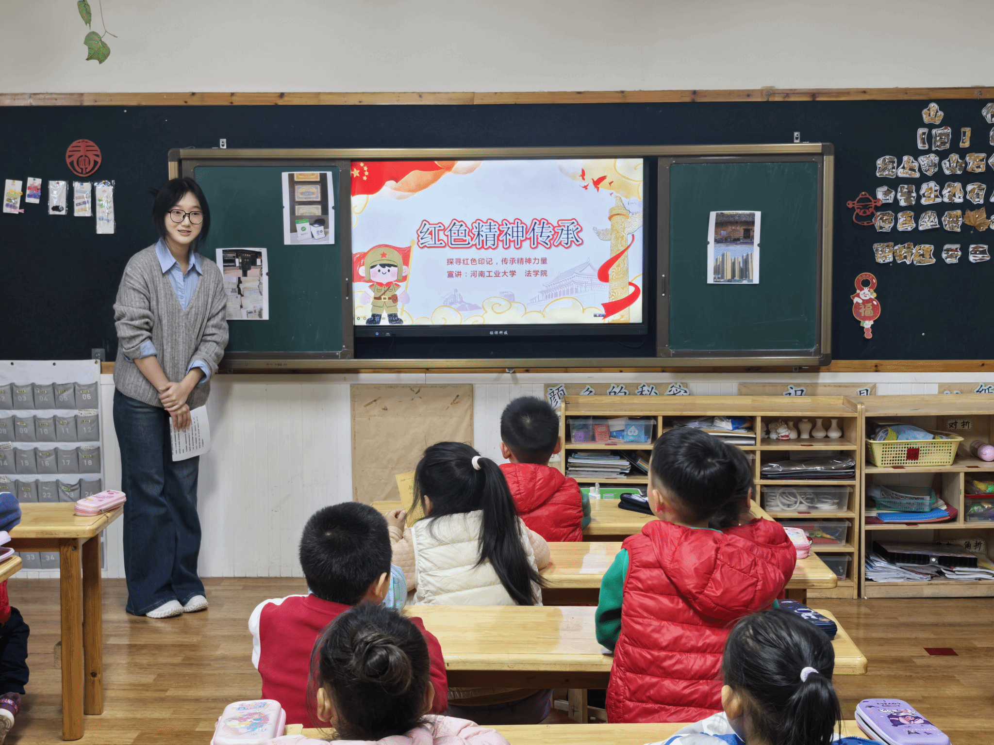 为深入贯彻党的二十届四中全会精神,落实学校“中国共产党人精神谱系”宣讲巡讲活动要求,推动红色精神在基层落地生根、浸润童心,12月3日,河南工业大学法学院大学生理论宣讲团走进高新区枫杨嘉幼儿园,开展了一场红色精神宣讲活动。