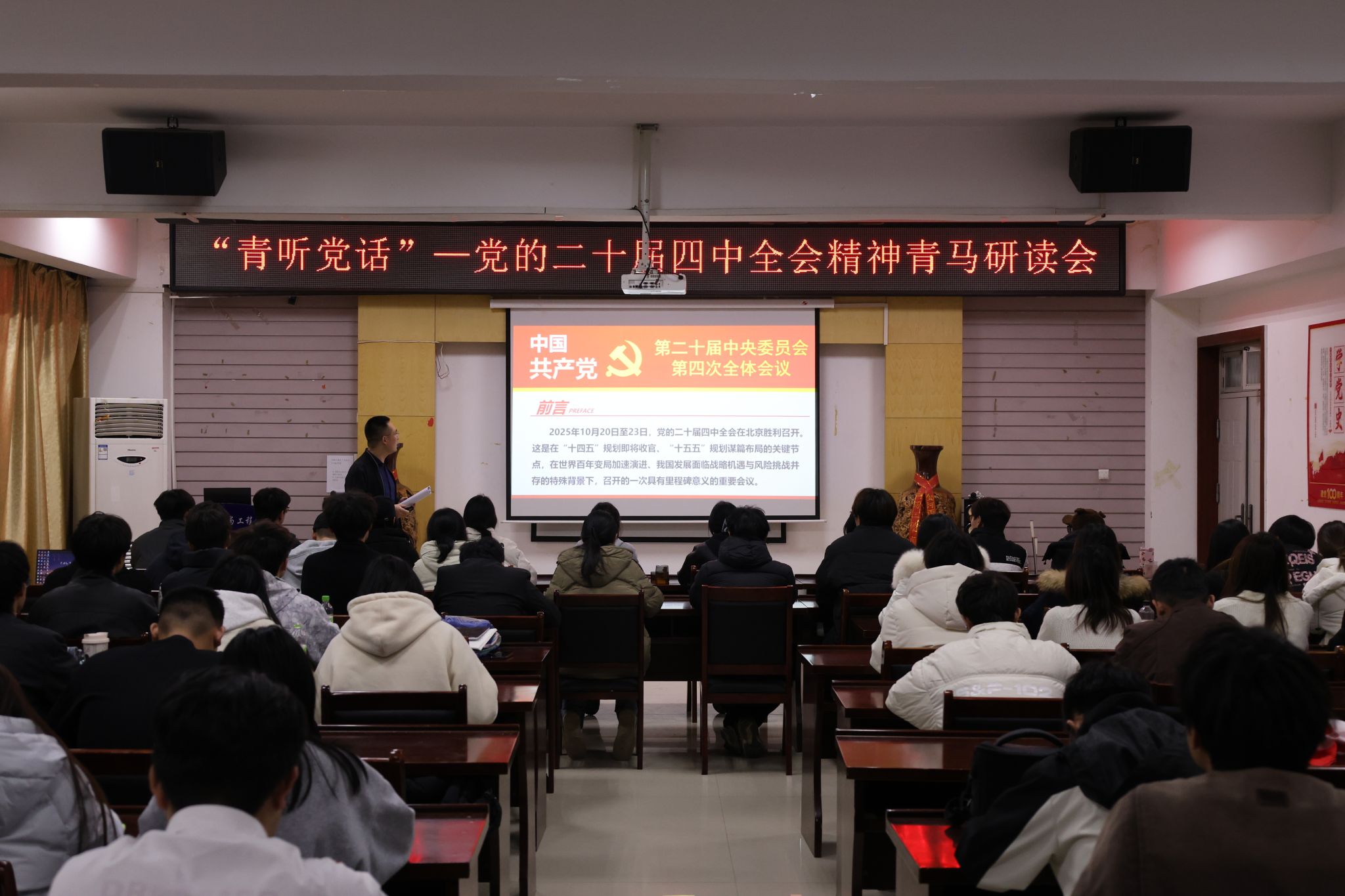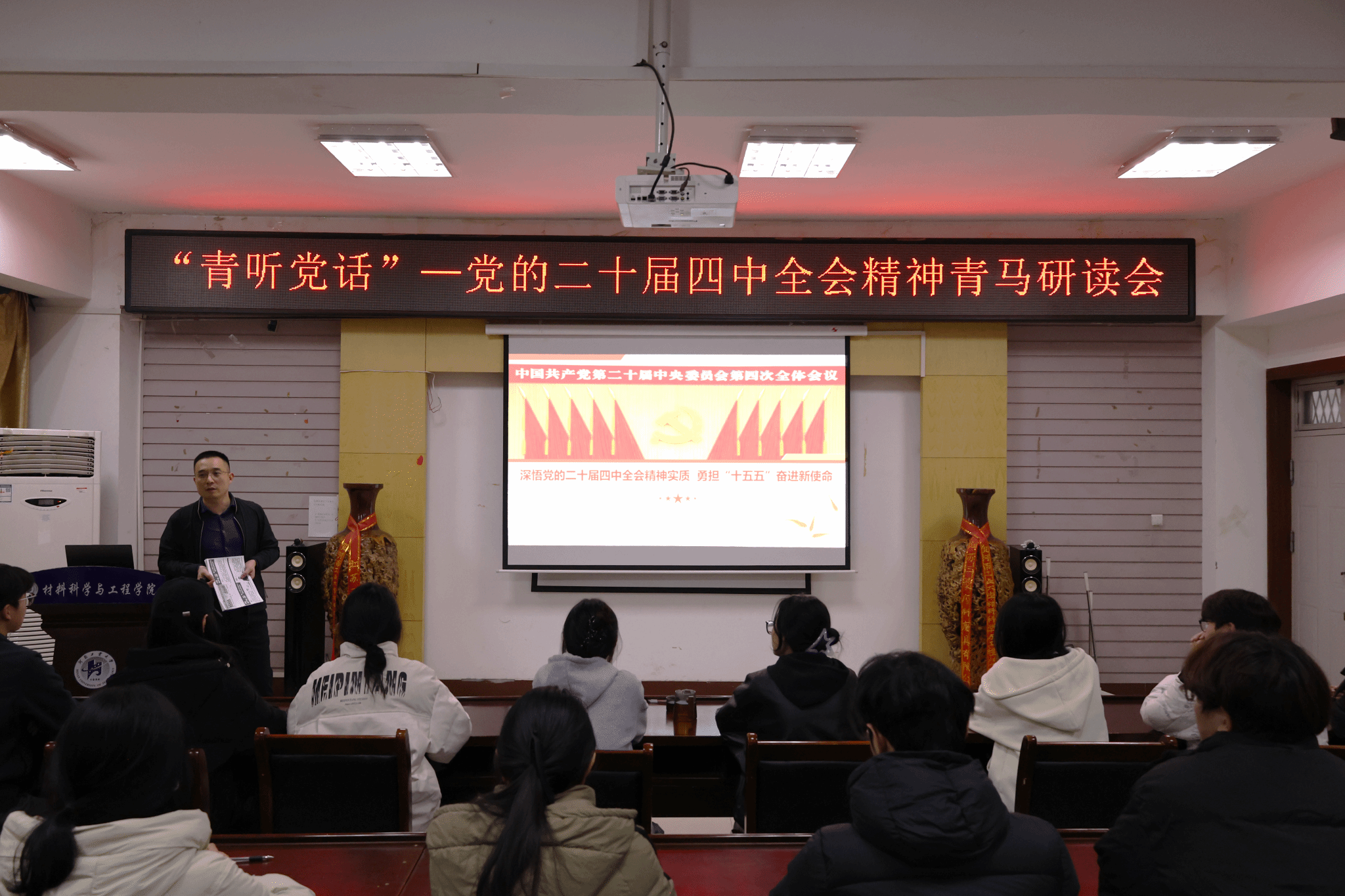 为深入学习贯彻党的二十届四中全会精神,引导青年学子深刻领悟“十五五”时期战略部署与中国式现代化内涵,12月4日,材料学院以“青听党话·筑梦同行”为主题在31号楼447教室举办青马工程专题研读会。学院党委副书记李建锋、全体辅导员及全体青马学员、学生骨干代表共同参与,在理论学习与思想碰撞中凝聚青春奋进力量。