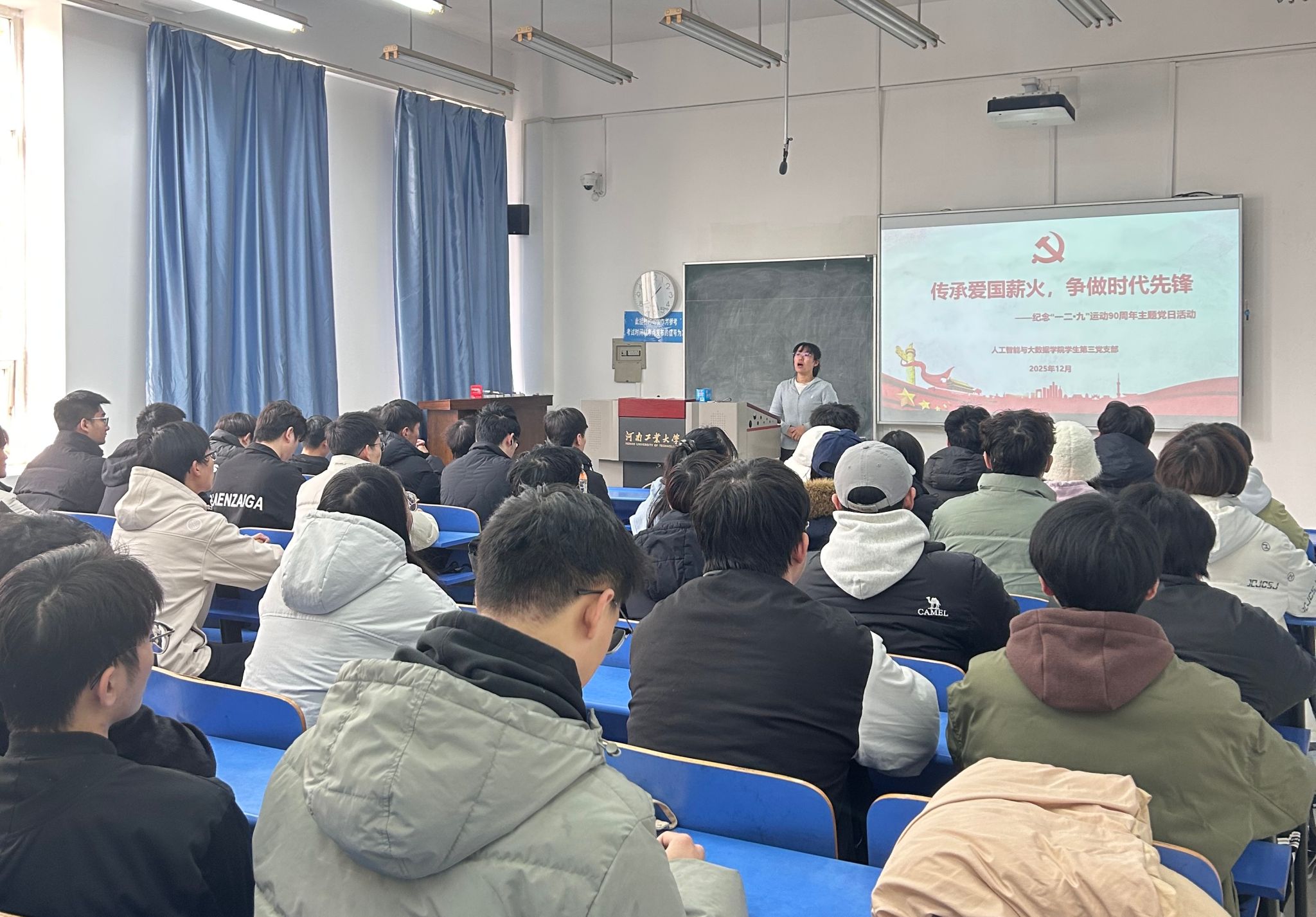 为传承一二▪九运动红色基因,厚植青年学子爱国情怀,12月9日,人工智能与大数据学院学生第三党支部开展纪念一二▪九运动主题党日活动。支部学生党员、入党积极分子参与本次活动,活动由党支部书记唐金杰主持。