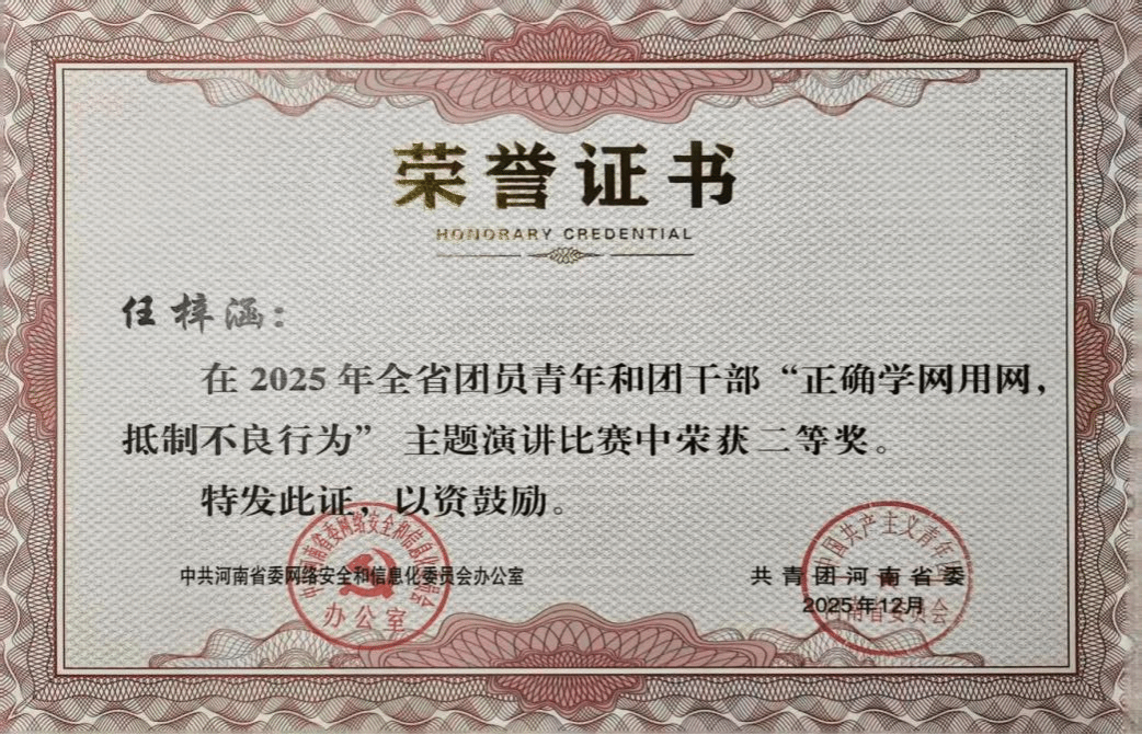近日,由河南省委网信办、共青团河南省委联合主办的全省团员青年和团干部“正确学网用网,抵制不良行为”主题演讲比赛获奖结果正式公布。我校新闻与传播学院孔丽老师指导的播音与主持艺术专业2401班学生任梓涵,凭借出色表现荣获省级二等奖。