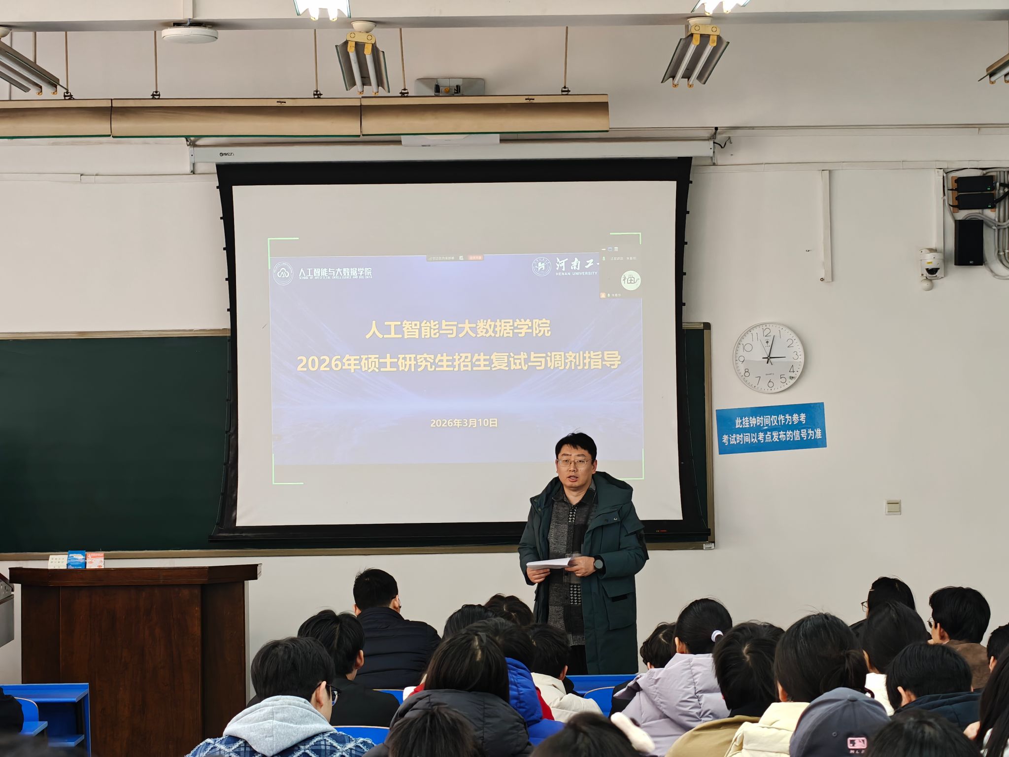 为帮助考研学生科学备考、精准把握复试节奏、科学规划调剂路径,缓解备考焦虑,提升复试及调剂成功率,3 月 10 日,人工智能与大数据学院在博学楼4136教室召开了2026届毕业生考研复试、调剂指导交流会。学院党委副书记赵志洋主持会议,副院长朱春华担任主讲嘉宾,各系系主任、全体辅导员、成功上岸的学生代表及考研学生共同参加了此次指导交流会。