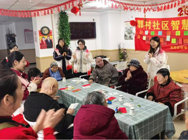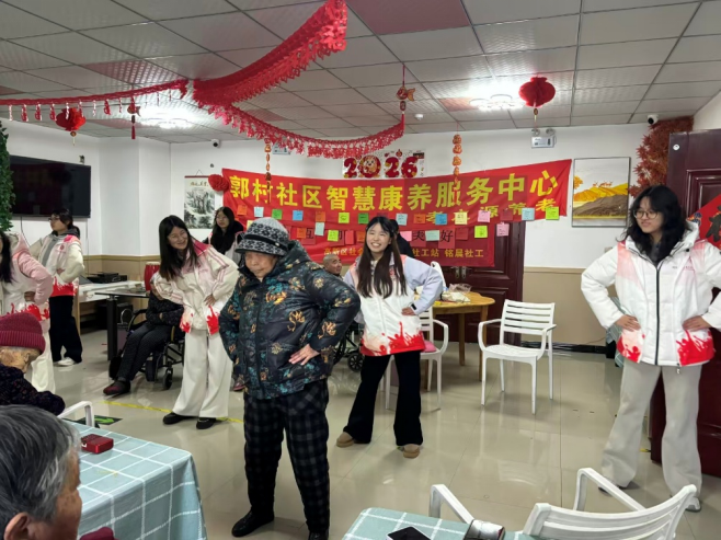 此外,志愿者还带领老人做手指操、伸展运动,组织桌面游戏和才艺展示等互动环节,引导老人参与集体活动。