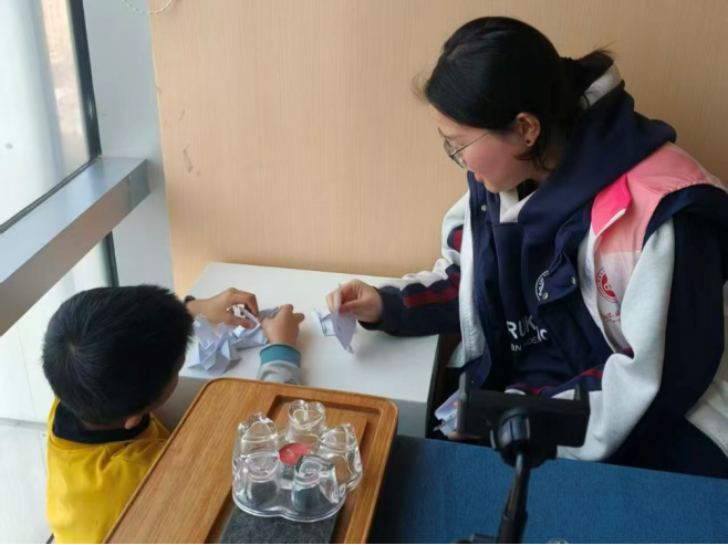 在仿图绘画环节,志愿者引导孩子临摹图画、自由涂抹,激发孩子的艺术创造力;在搭积木环节,志愿者从模仿搭建入手,引导孩子完成小目标;在绘本带读环节,志愿者挑选画面清晰的绘本,用夸张语气和丰富表情讲述故事,通过“指物命名”提升孩子的语言理解能力。