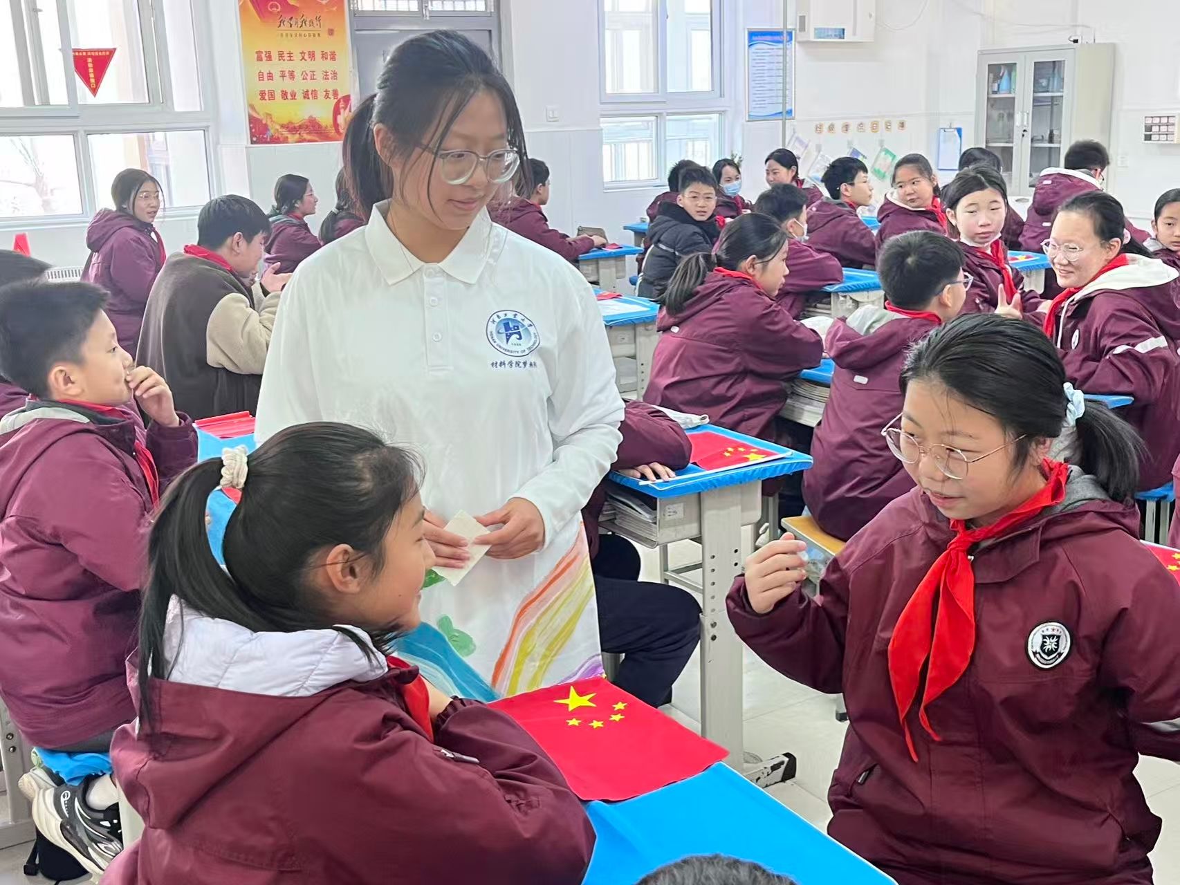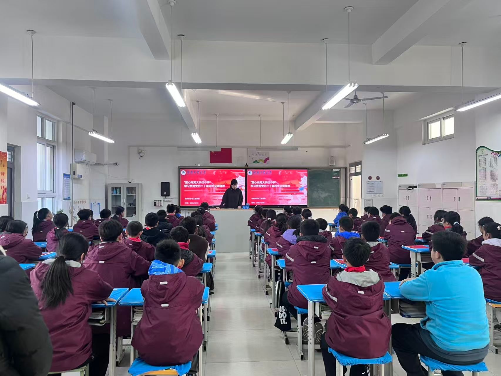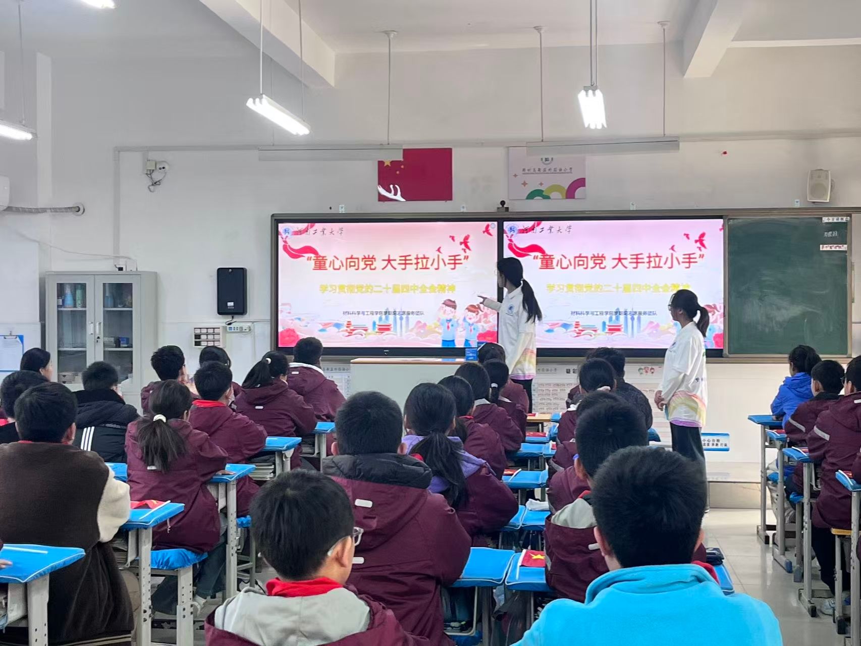 为推动党的二十届四中全会精神进校园、润童心,引导少年儿童厚植爱党爱国情怀,12月5号,在校团委的部署下,我校青年讲师团成员材料学院团委书记储雅珩携手大学生理论宣讲团成员、材料学院团委学生会轮值主席杨晨妍走进高新区外国语小学,以“童心向党 大手拉小手”为主题开展专场宣讲活动。宣讲团成员与外小师生齐聚一堂,用“童言童语”解读时代蓝图,以互动体验传递红色力量,让全会精神在孩子们心中生根发芽。